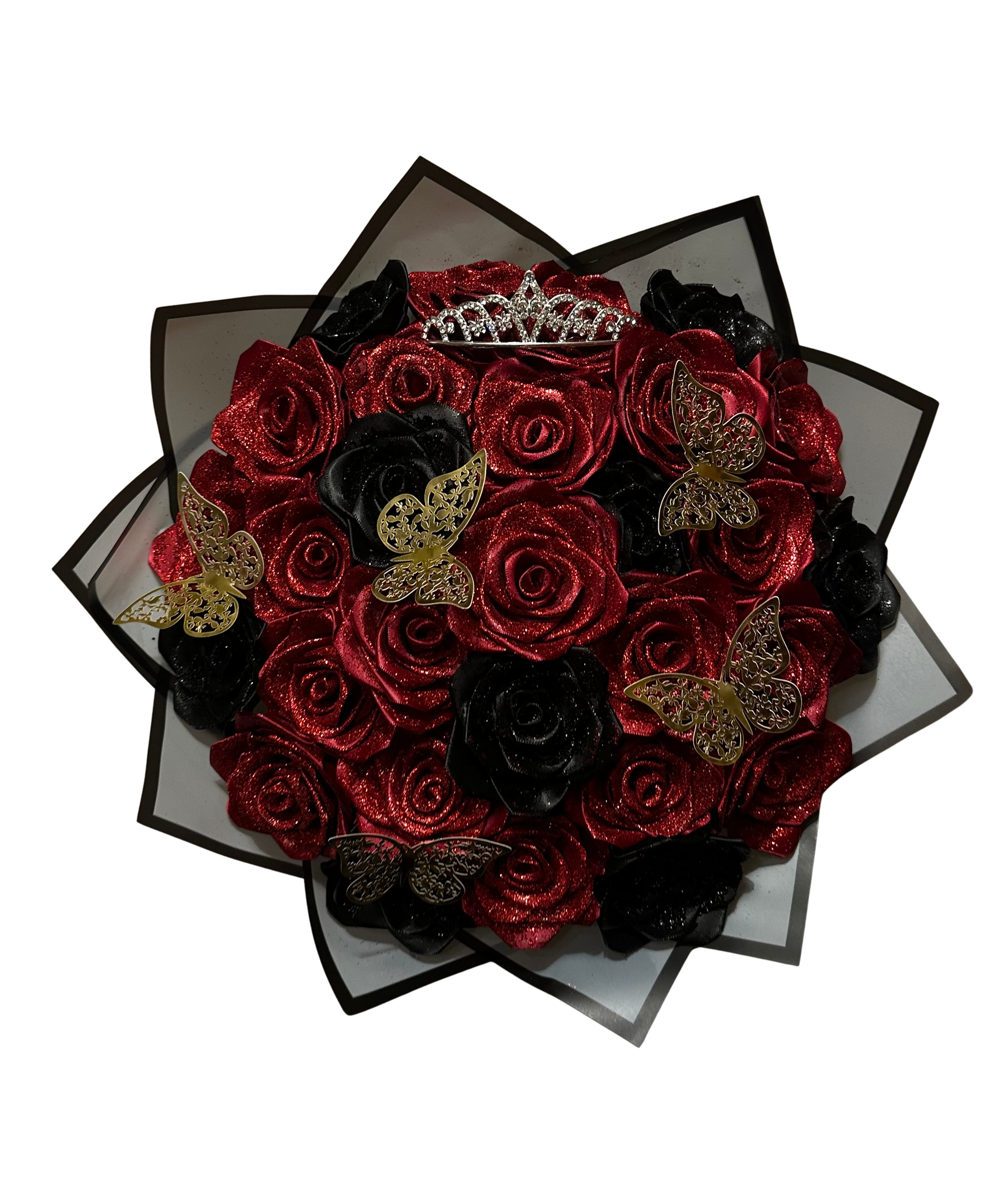 Tvirta ir kokybiška 29 amžinųjų rožių puokštė, išlaikanti savo grožį amžinai. Pagaminta iš aukštos kokybės kaspinių, dekoruota subtiliais drugeliais ir elegantiška karūnėle. Puiki dovana mamai, mylimajai ar net vyrui.