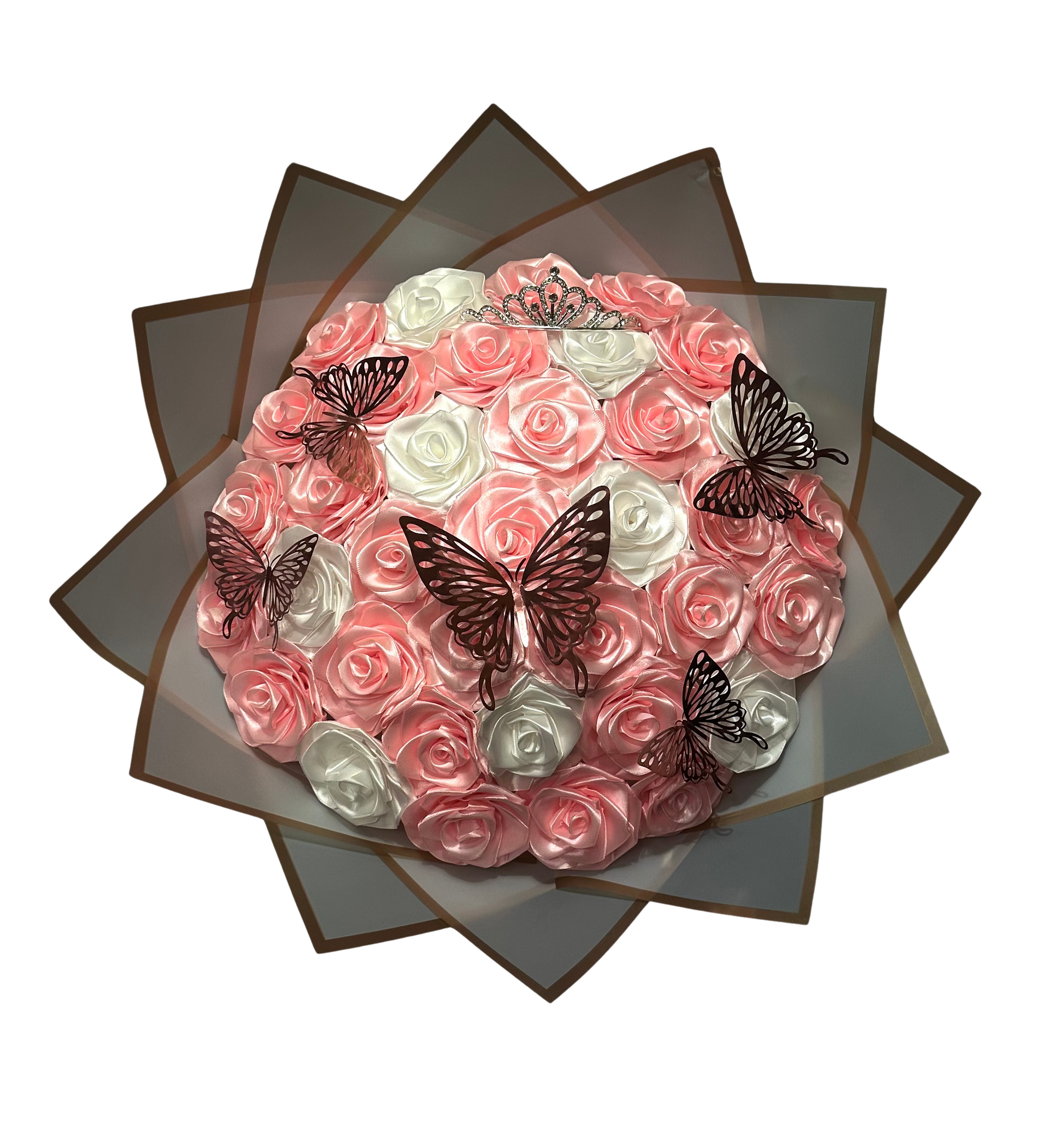 Tvirta ir kokybiška 36 amžinųjų rožių puokštė, išlaikanti savo grožį amžinai. Pagaminta iš aukštos kokybės kaspinių, dekoruota subtiliais drugeliais ir elegantiška karūnėle. Puiki dovana mamai, mylimajai ar net vyrui.