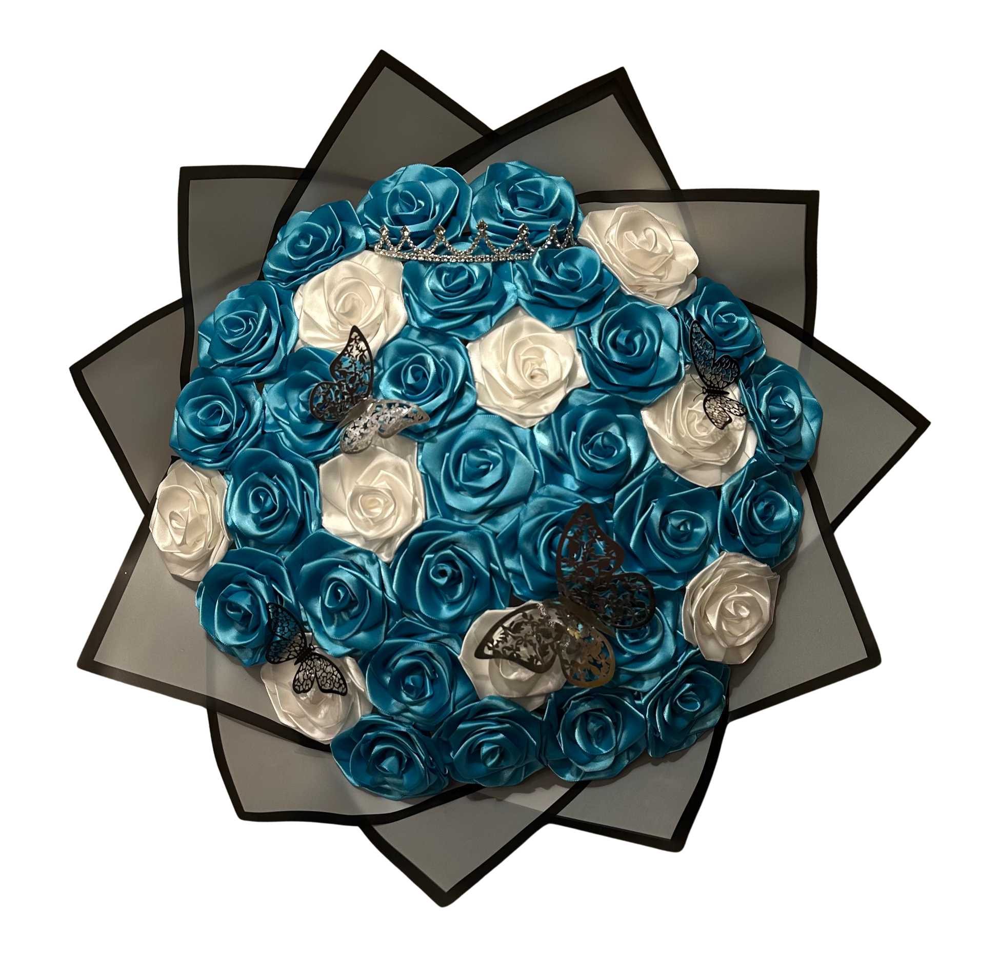 Tvirta ir kokybiška 36 amžinųjų rožių puokštė, išlaikanti savo grožį amžinai. Pagaminta iš aukštos kokybės kaspinių, dekoruota subtiliais drugeliais ir elegantiška karūnėle. Puiki dovana mamai, mylimajai ar net vyrui.